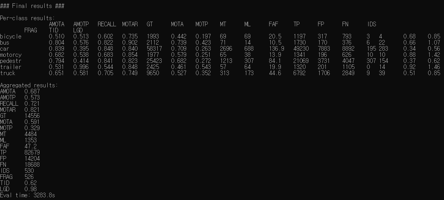 (ab3dmot) C:\Users\rosha\OneDrive\Desktop\AVE_Lab\nuscenes-devkit\python-sdk\nuscenes\eval\tracking>python evaluate.py --result_path C:\Users\rosha\OneDrive\Desktop\AVE_Lab\SimpleTrack\result\SimpleTrack2Hz\results\results.json --output_dir C:\Users\rosha\OneDrive\Desktop\AVE_Lab\evaluation --eval_set val --dataroot C:\Users\rosha\OneDrive\Desktop\AVE_Lab\nuscenes