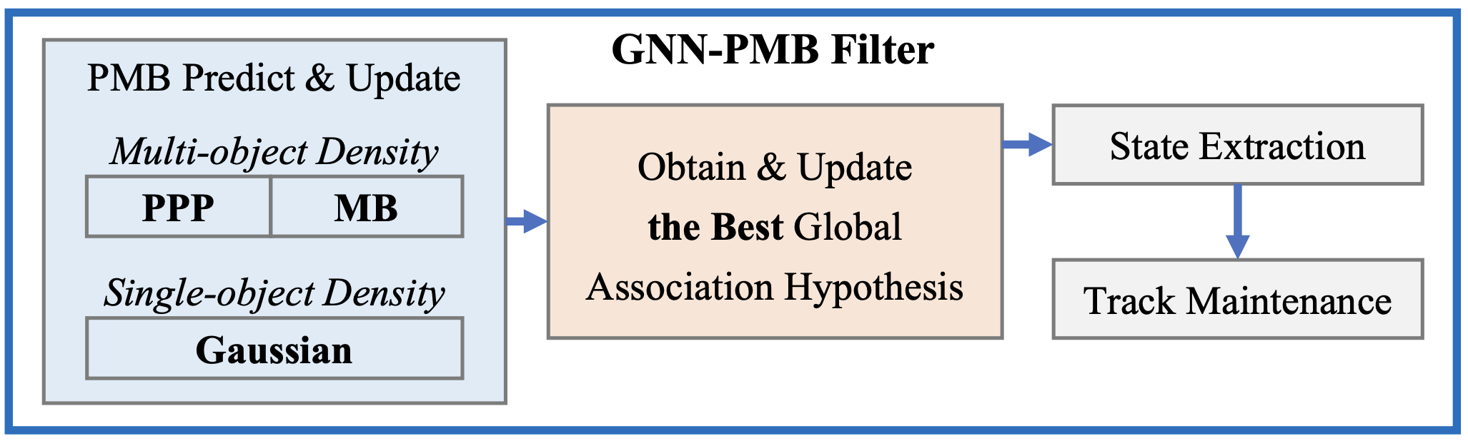 POT알고리즘의 경우 GNN-PMB filter를 사용하였다. 이는 시간에 걸쳐 PMB 밀도를 propagate함으로써 다중 객체 상태를 추정하는 방식으로 undetected object에 대해서는 Poisson point process를, detected object에 대해서는 multi-Bernoulli process를 사용한다.