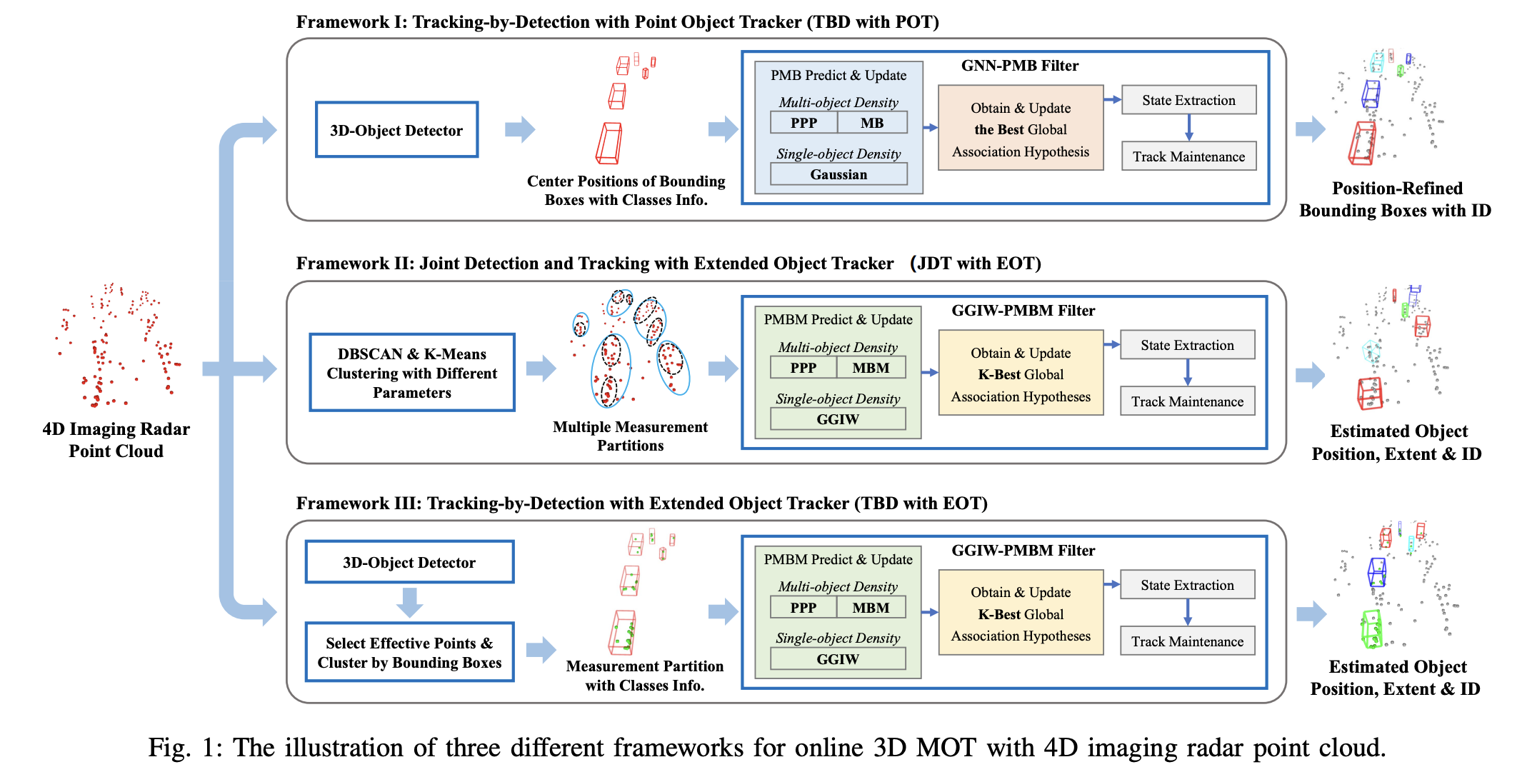 - povided first benchmark for subsequent studies on 4D imaging radar-based online 3D MOT by comparing POT and EOT frameworks.