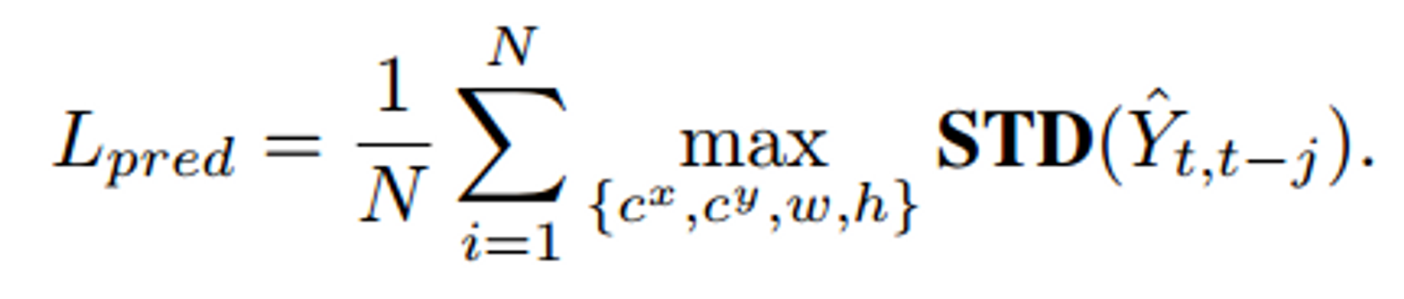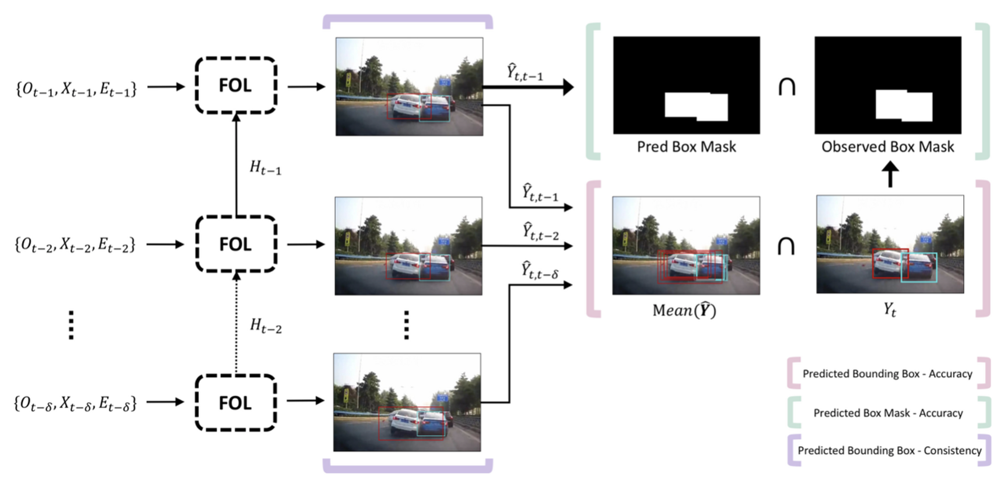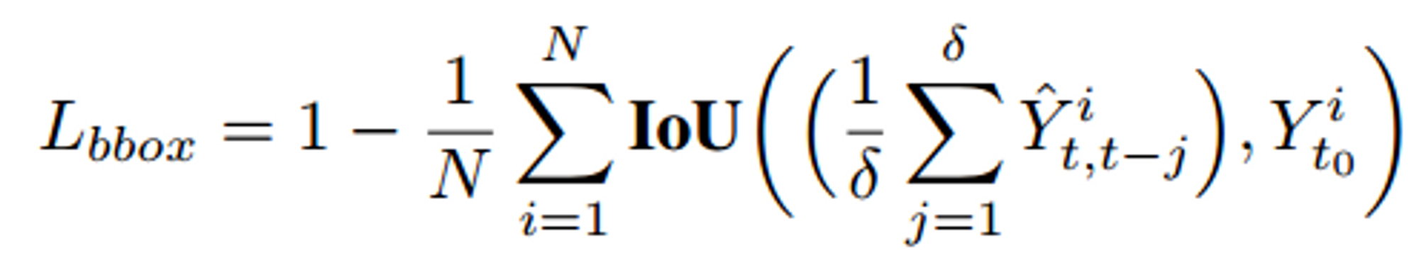 - 모델이 예측한 미래 Bounding box 모음은 Y_t={Y_t+1,Y_t+2,...,Y_t+δ} 표현 (현재 시간 t 에서 t+δ 까지 예측)