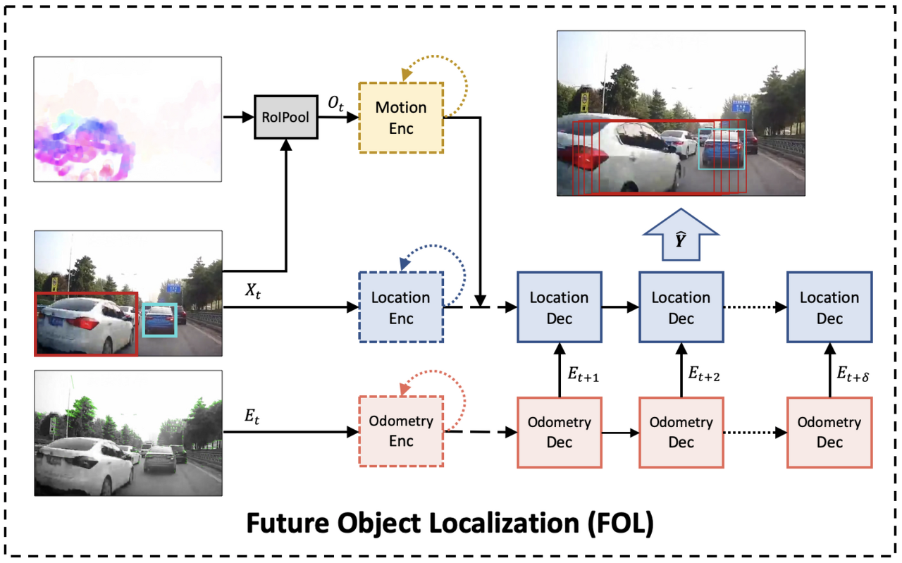 Ego-motion 정보는 보다 정확한 예측을 위해 꼭 필요하기 때문에 이를 모델에 적용시키기 위해서 모델은 ego-motion 정보를 입력으로 받는 Odometry Encoder라는 또 다른 Encoder를 가집니다. 이 부분 또한 RNN encoder-decoder 구조로써 이 출력은 Location Decoder에게 입력되어 객체의 미래 위치를 보다 정확하게 예측할 수 있도록 도와주는 역할을 한다.