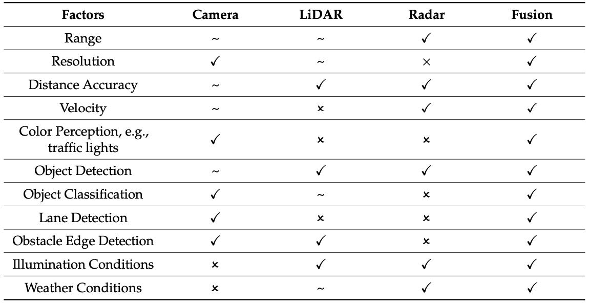 - camera, LiDAR, Radar 센서마다 회사 별 스펙 비교(table 2, 3, 4)