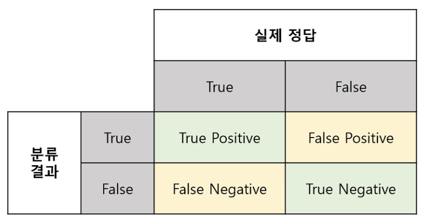 - True Negative(TN) : 실제 False인 정답을 False라고 예측 (정답)
